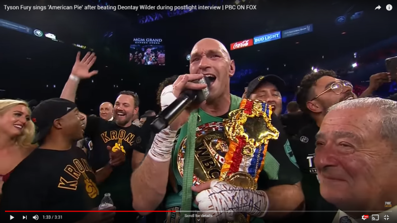 Having dismantled Deontay Wilder in seven rounds to claim the WBC heavyweight title in Las Vegas on Saturday night, the Gypsy King swapped boxing gloves for a microphone as he launched into a rendition of Don McLean's American Pie. [ Twitter ] [ YouTube ] [ Facebook ]