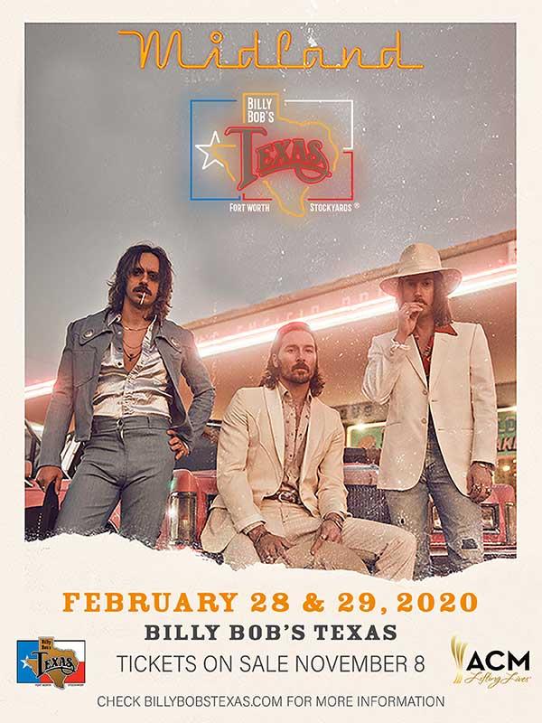 .@BillyBobsTexas welcomes @MidlandOfficial for #ACMLiftingLives benefit shows February 28 & 29. Tickets on sale November 8