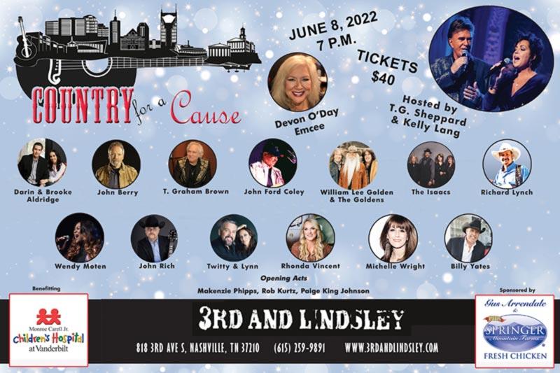 NASHVILLE, Tenn. – John Rich, Michelle Wright, John Berry, Rhonda Vincent, Wendy Moten, John Ford Coley, T. Graham Brown, Twitty & Lynn, The Isaacs, William Lee Golden and The Goldens, Darin & Brooke Aldridge, Richard Lynch, Devon O’Day, Rob Kurtz, Billy Yates, Makenzie Phipps, and Paige King Johnson are set to join hosts T.G. Sheppard and Kelly Lang for Country For A Cause at Nashville’s 3rd & Lindsley, Wednesday, June 8 at 7 PM benefitting Monroe Carell Jr. Children’s Hospital at Vanderbilt. The show is sponsored by Gus Arrendale and Springer Mountain Farms. Tickets are on sale now and are $40 for general admission.