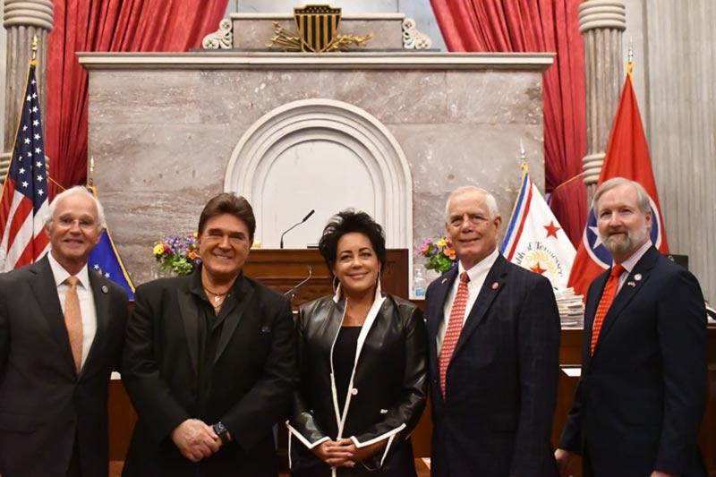 Pictured L-R: TN House Representative Ron Travis, T.G. Sheppard, Kelly Lang, TN Speaker Pro Tempore Pat Marsh, and Chairman Chris Todd