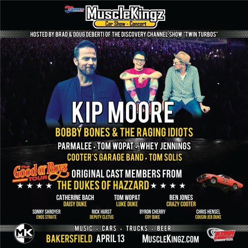 BAKERSFIELD, Calif. – The all-day, family-friendly MuscleKingz Car Show & Concert series will kick-off in Bakersfield, California on Saturday, April 13 at the Kern County Raceway with performances by platinum-selling hitmaker KIP MOORE, Dancing with the Stars winner and award-winning radio personality BOBBY BONES & THE RAGING IDIOTS, chart-topping country group PARMALEE, The Dukes of Hazzard cast member TOM WOPAT, the grandson of Waylon Jennings WHEY JENNINGS, COOTER’S GARAGE BAND, TOM SOLIS and more. Tickets and all info available at www.MuscleKingz.com.