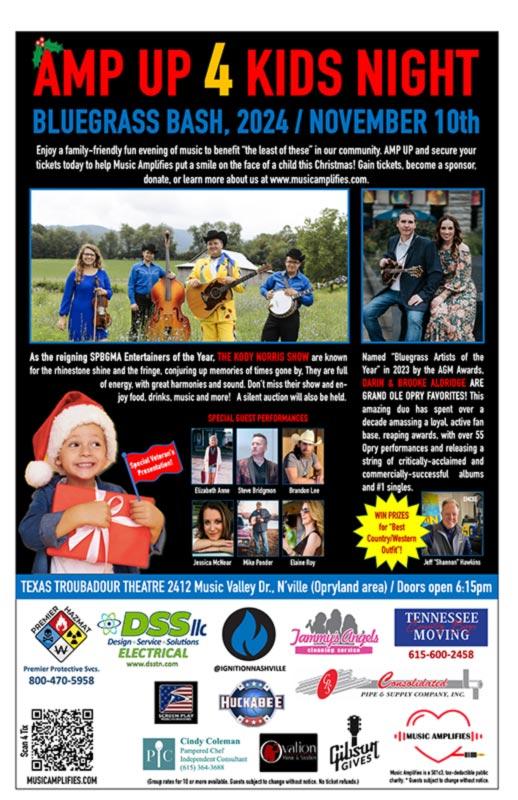 NASHVILLE, Tenn. - Bluegrass favorites The Kody Norris Show and Darin & Brooke Aldridge along with Elaine Roy, Elizabeth Anne, Steve Bridgmon, Jessica McNear, Mike Ponder and Brandon Lee, to perform at ‘AMP UP 4 KIDS NIGHT’ to benefit MUSIC AMPLIFIES at The Troubadour located at 2412 Music Valley Drive in Nashville, Tennessee on Sunday, November 10th at 7:00 PM! Doors open at 6:15 PM.