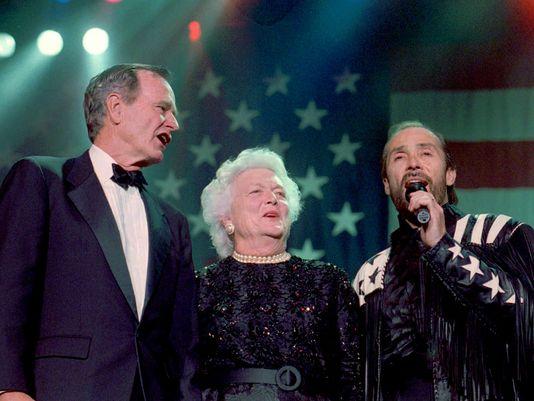 Lee Greenwood performs "God Bless The USA" for then Vice President George H.W. Bush during the 1988 Presidential campaign