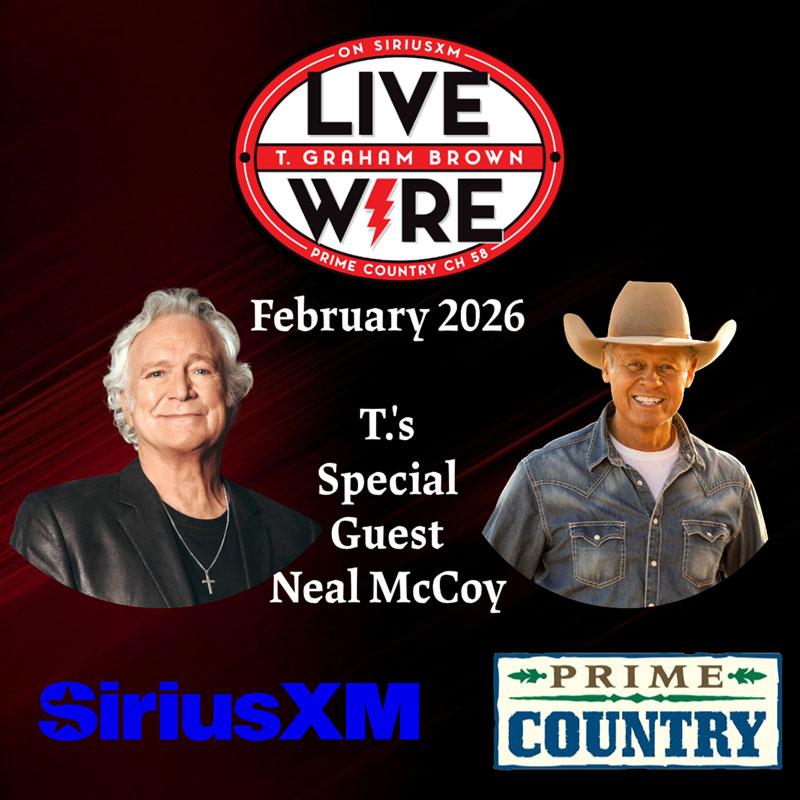 NASHVILLE, Tenn. - GRAMMY®-nominated, CMA and EMMY Award-winner, and Grand Ole Opry member T. Graham Brown returns with the latest episode of LIVE WIRE on SiriusXM’s Prime Country (Channel 58), starting Wednesday, February 04 at 10/9 central p.m. This episode features a special interview with hitmaker Neal McCoy, whose hit songs include “Wink,” “No Doubt About It,” and “The Shake.” At the White House, he celebrated the 10th anniversary of reciting the Pledge of Allegiance daily across his social media platforms.