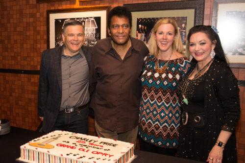 L-R: Dan Rogers – Director Marketing, Communication and Artist Initiatives, Grand Ole Opry, Charley Pride, Gina Keltner – Sr. Talent Manager, Grand Ole Opry and Opry member Crystal Gayle. Photo by Rachael Black, courtesy of the Grand Ole Opry.[/caption]