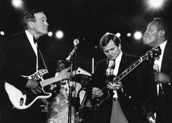 After receiving “The Prez” guitar — a present — from Sam Moore of the former Sam and Dave soul duo, President Bush, left, plays the instrument with Republican National Committee Chairman Lee Atwater on Jan. 21, 1989. (Rick Lipski/The Washington Post)