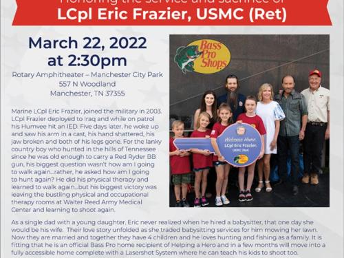 TN GOV. BILL LEE TO JOIN LEE GREENWOOD, HELPING A HERO AND BASS PRO SHOPS TO BREAK GROUND ON SPECIALLY ADAPTED HOME FOR TENNESSEE NATIVE LCPL ERIC FRAZIER, USMC (Ret) WHO LOST BOTH LEGS IN IRAQ