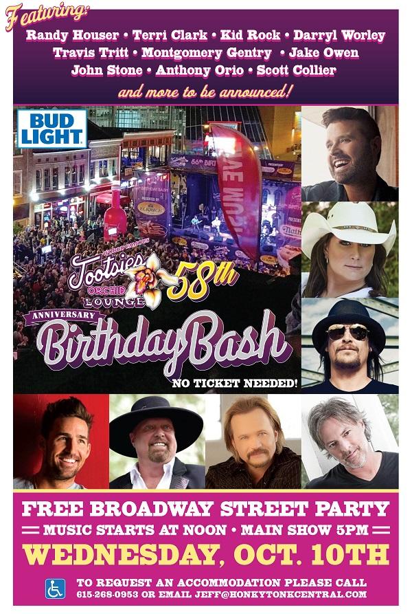 Tootsie's (@Tootsiesnet) 58th FREE #birthday bash #concert Oct 10th to feature @RandyHouser @KidRock @JakeOwen @TravisTritt @TerriClarkMusic & more in downtown #Nashville #Broadway