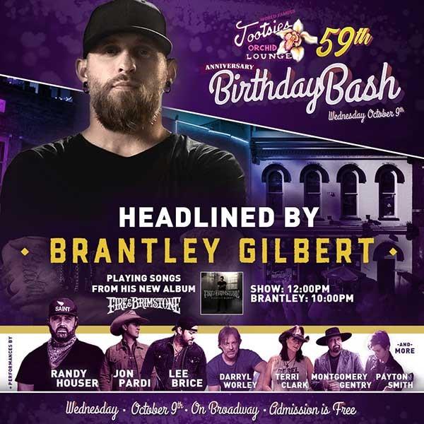 NASHVILLE, Tenn. – The World Famous Tootsie’s Orchid Lounge, Music City’s legendary honky-tonk, will celebrate its 59th Birthday in downtown Nashville Wednesday, October 9th. As part of the celebration, Tootsie’s Orchid Lounge will feature entertainment on the outdoor Broadway stage throughout the day with a FREE, star-studded evening concert. Featured headliners include Brantley Gilbert, Randy Houser, Jon Pardi, and Lee Brice!
